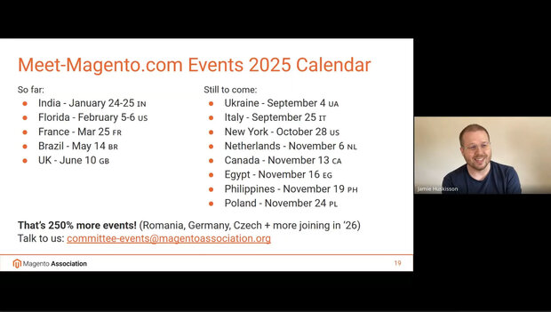 Jamie Huskisson brought great news from the Events Committee: Magento events have grown by over 250% year over year. From the UK and India to Brazil, France, and the Philippines, the global momentum is clear. A new global Call for Papers process simplifies speaker engagement, while new support playbooks and resources aim to empower event organizers everywhere.