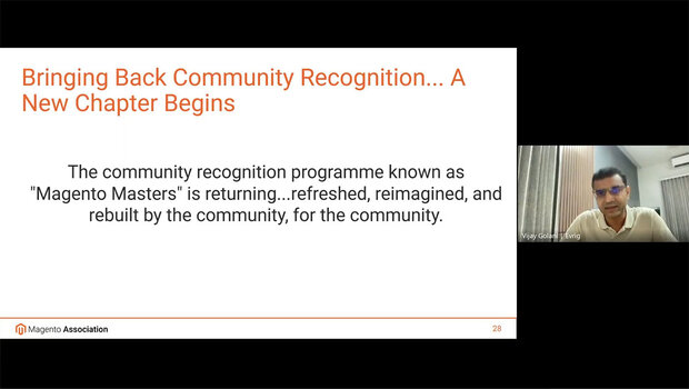 Vijay Golani presented plans to reboot the Magento Recognition Program—under a new, inclusive name—and led by a volunteer committee focused on celebrating diverse contributions.