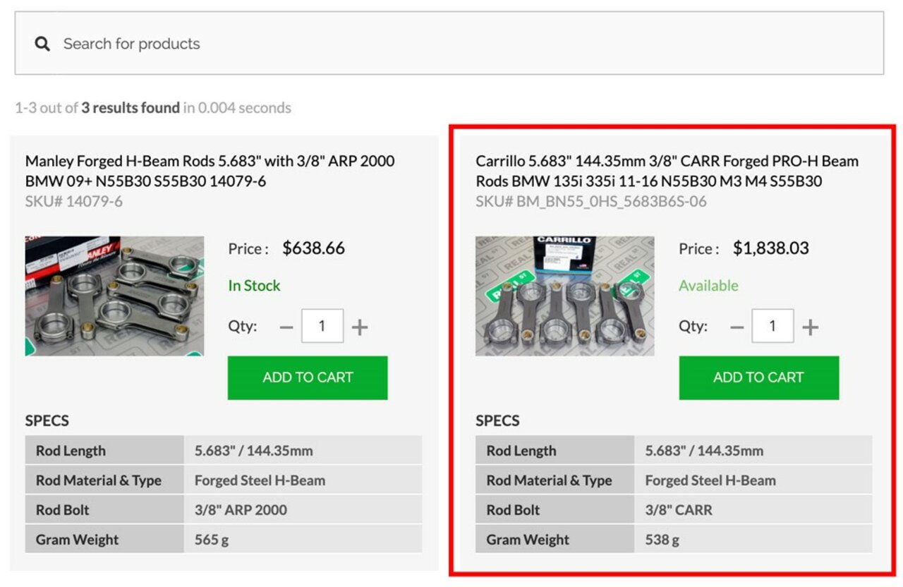 - Custom Item Cards. For each of its products, Real Street Performance built custom item cards to show customers the distinct specifications of each product below the thumbnail. Users can differentiate between products without having to activate a quick view or going to the product detail page. The item cards display product images, specifications, SKU number, price, product availability and “add to cart” functionality. This creates a simpler, speedier way for customers to find what they are looking for.