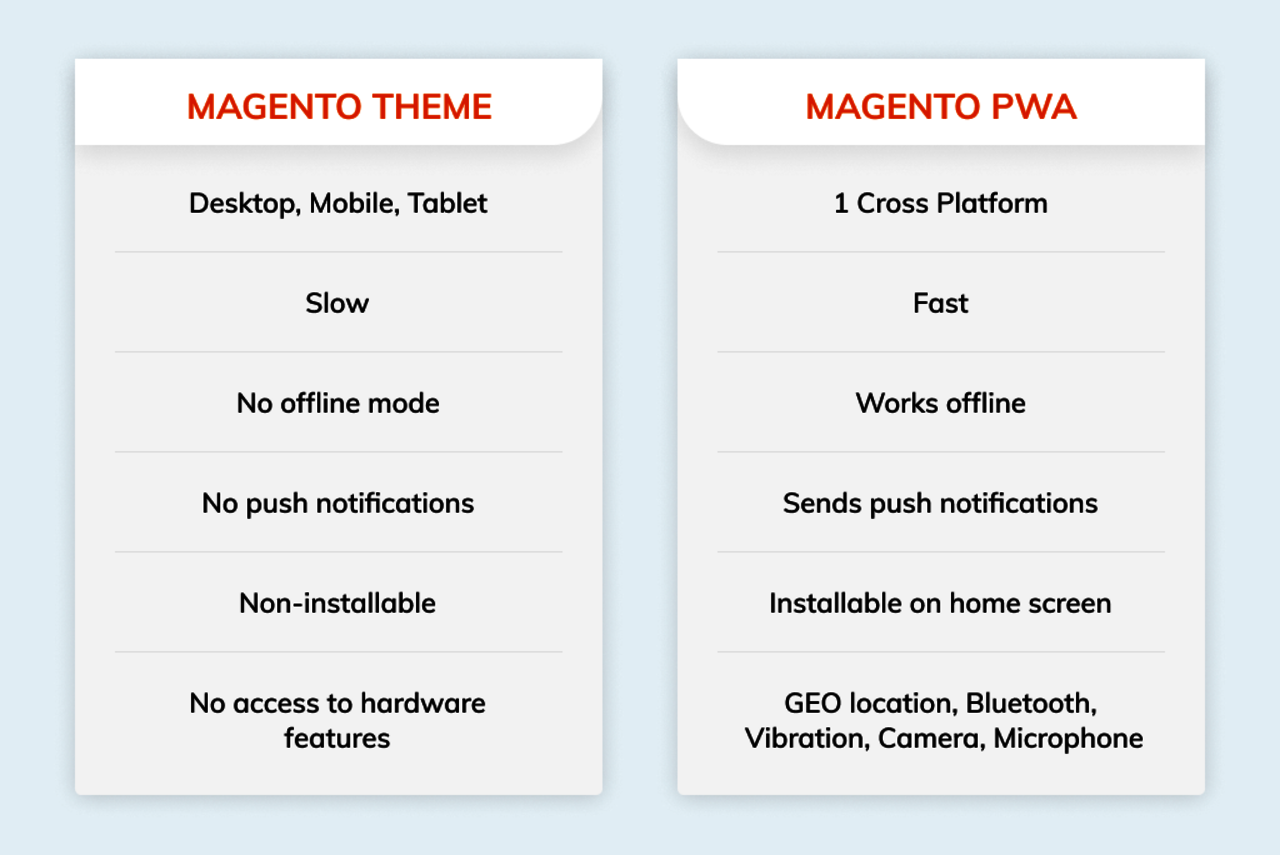 In reality, PWA is a storefront that incorporates a service worker and a manifest file. Most often, PWAs are developed as a headless solution that runs on a complex system of its own. If you go headless with PWA, your website will still run on the Magento backend (through an API), and all site data will be saved. However, the frontend would be completely independent of Magento, which opens a leeway of possibilities missing in the case of conventional themes
