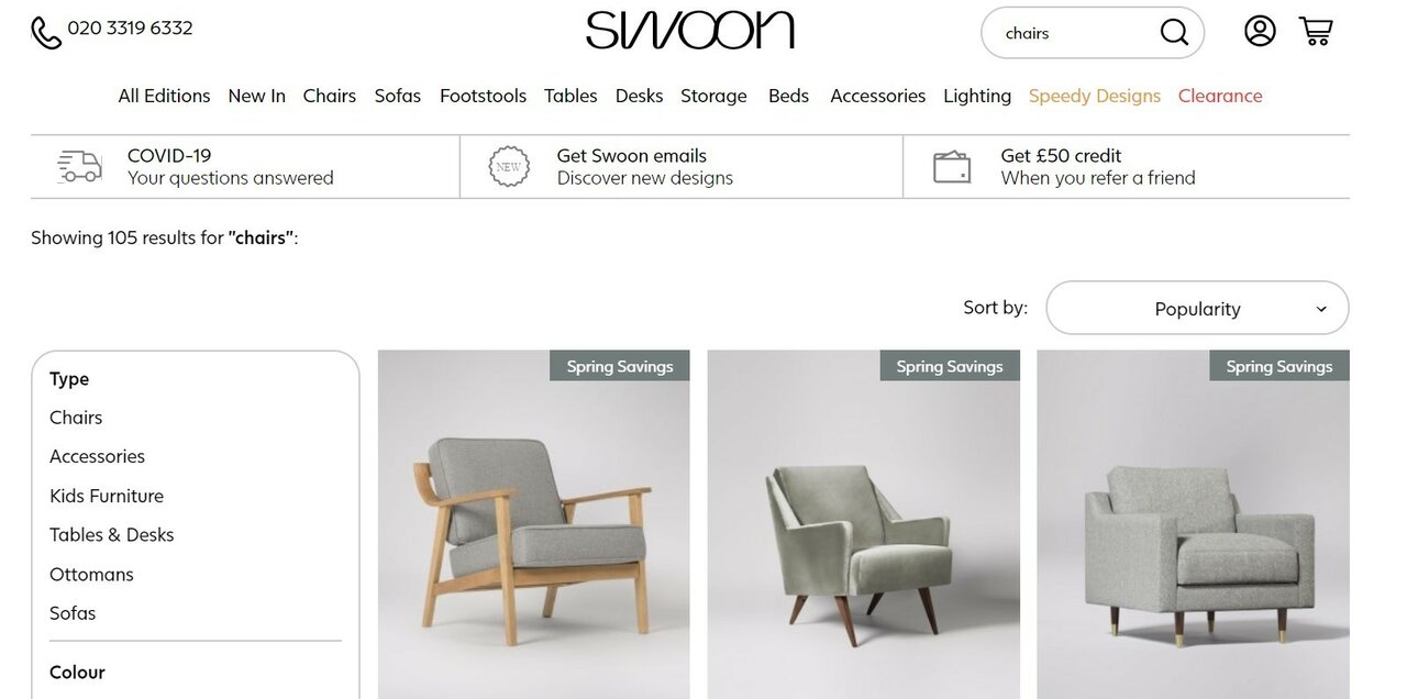 In just a few clicks, Swoon’s search function learned the customer was looking for chairs in shades of gray and reordered the product list accordingly.
