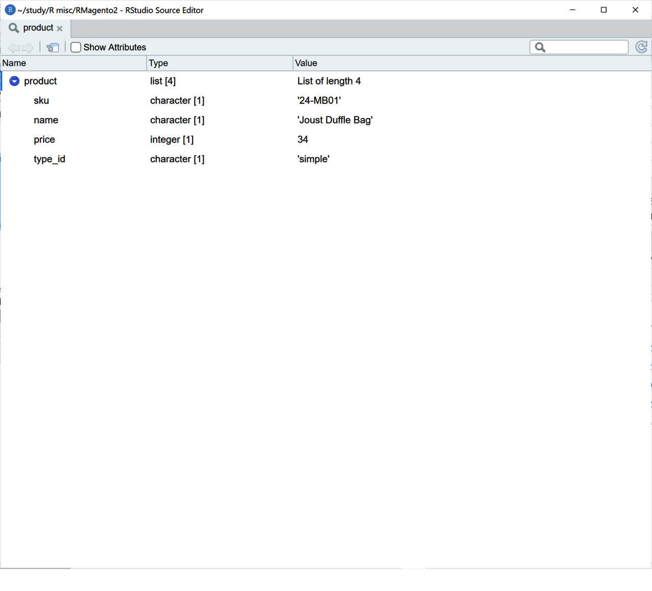 product <- getm2productdata (url=urlbase, sku="24-MB01", fields="sku,price,name,type_id", auth=auth)