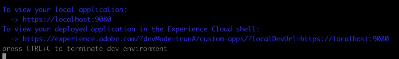 - After you've executed aio app run –local you will receive links to open your bootstrapped application in browser, which looks like this: