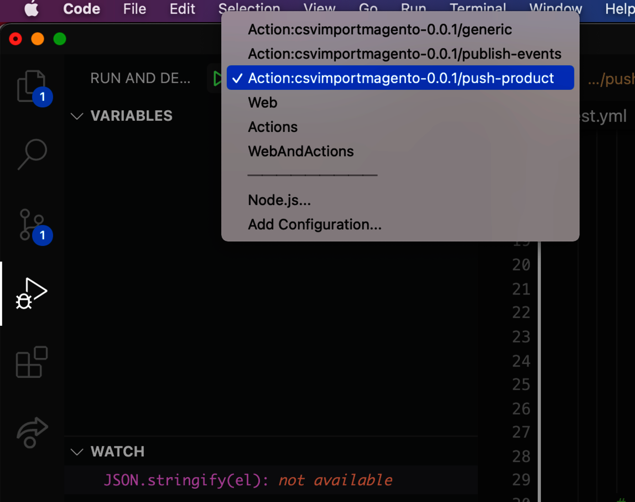 Debugging of a Firefly application is quite easy. Into .vscode/launch.json, add the following code, especially if you are adding a new runtime action: