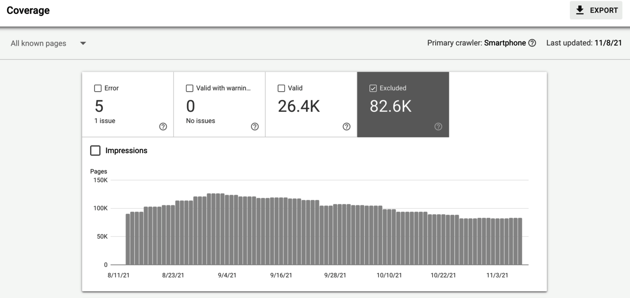 After your site launches, you should pay close attention to the search index coverage reports in Google Search Console. In particular, check out the Excluded URLs report, and watch for those that are being excluded from Google Search on the "Not Found (404)" line.