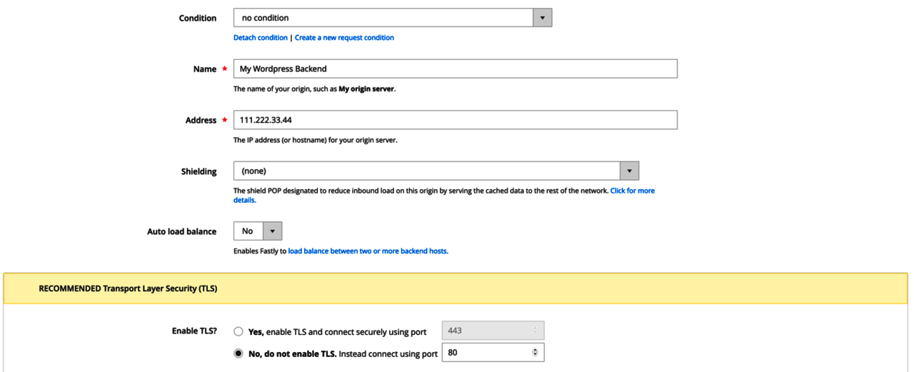 Go to Magento Admin, then choose Stores → Configuration → Advanced → System → Full Page Cache → Fastly configuration → Backend Settings → Create new Backend and define the IP of your CMS installation in the 'Address’ field.