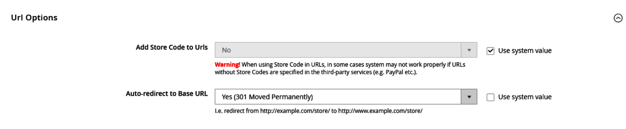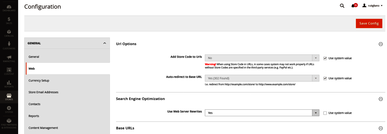 Again, in the Stores > Configuration > General > Web section, set the correct domain with "https://" in both "Base URLs" and "Base URLs (Secure)." Regarding the presence or absence of the "www" in the domain, it is essential to always use the same setting. Therefore, if a domain has already been indexed by Google with the "www" (you can verify this by using the string "site:mywebsite.com"), it is advisable to maintain the same setting over time by writing in both Base URLs and Base URLs (Secure): "https://www.mywebsite.com.”