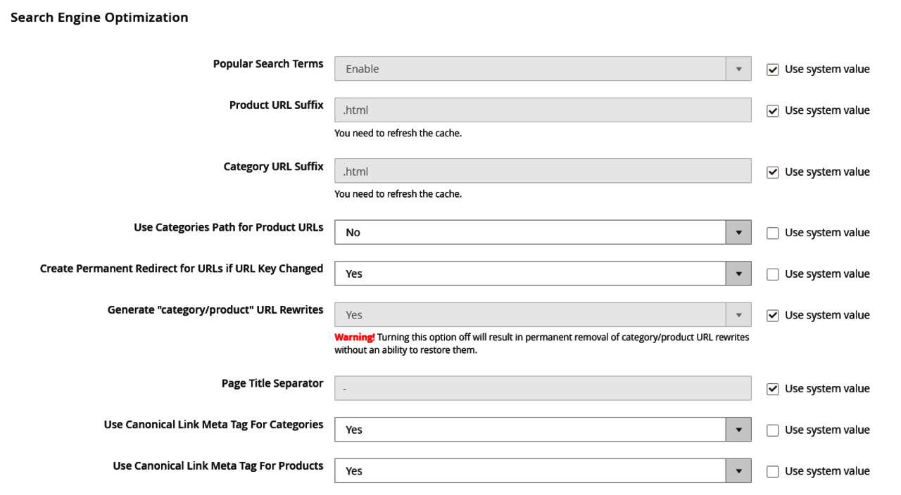 Next, we need to make sure that Magento tells search engines the best page version in case of similar pages (think, for example, of clothing products that have multiple pages that are almost identical to each other but have different URLs, one for each size/color). In these scenarios, the "rel canonical" attribute comes into play, which is automatically set by Magento if the following items are set in Stores > Configuration > Catalog > Search Engine Optimization: