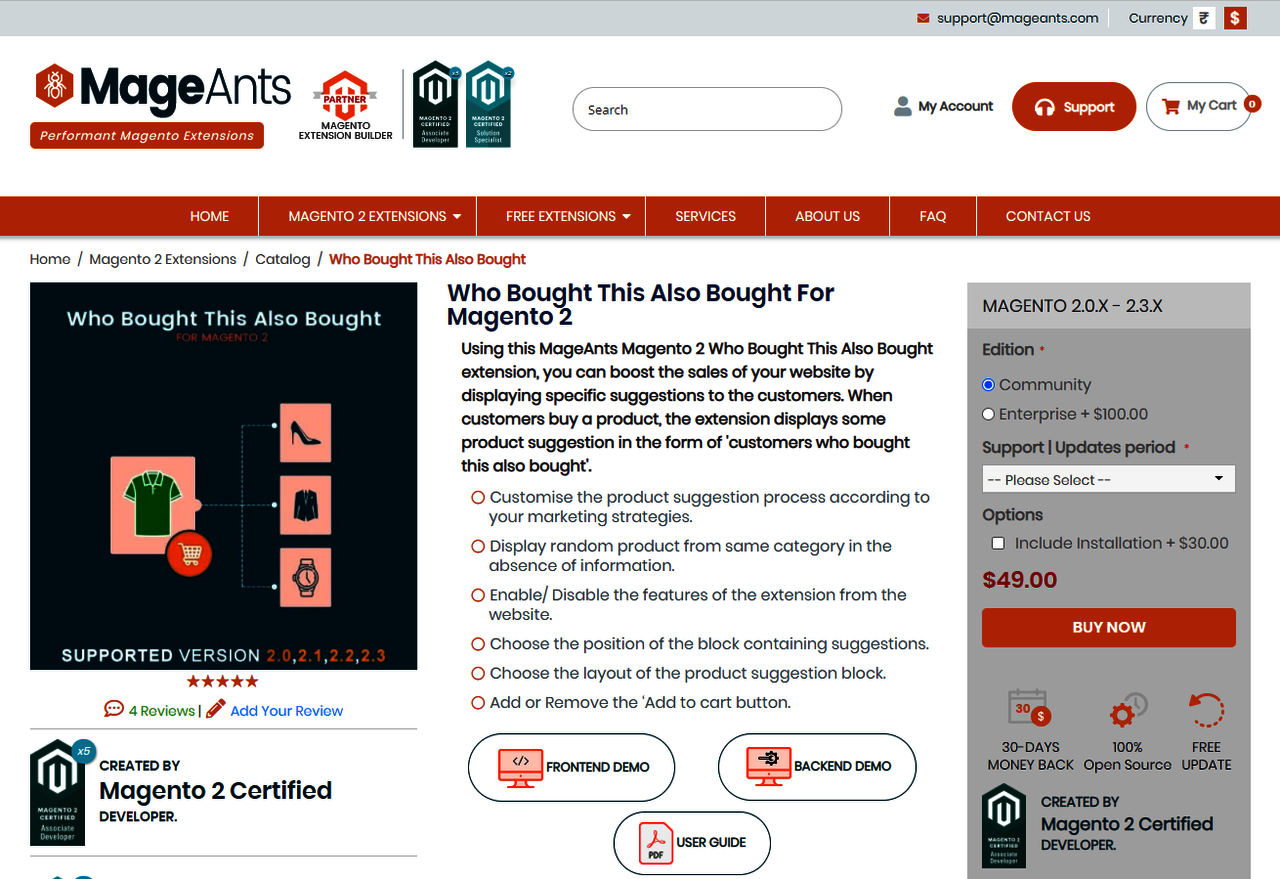 With the Magento 2 Who Bought This Also Bought from Mageants, users can show the shoppers the information of the relevant products, including their features and prices, with the main item and motivate the shoppers to purchase them.