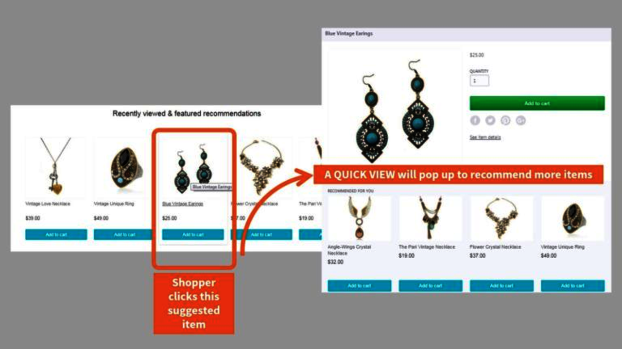 In addition, the extension offers an interesting feature: Quick View. When a shopper clicks on a suggested item shown below a product page, a pop-up including some recommended products will show up automatically.